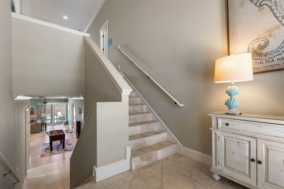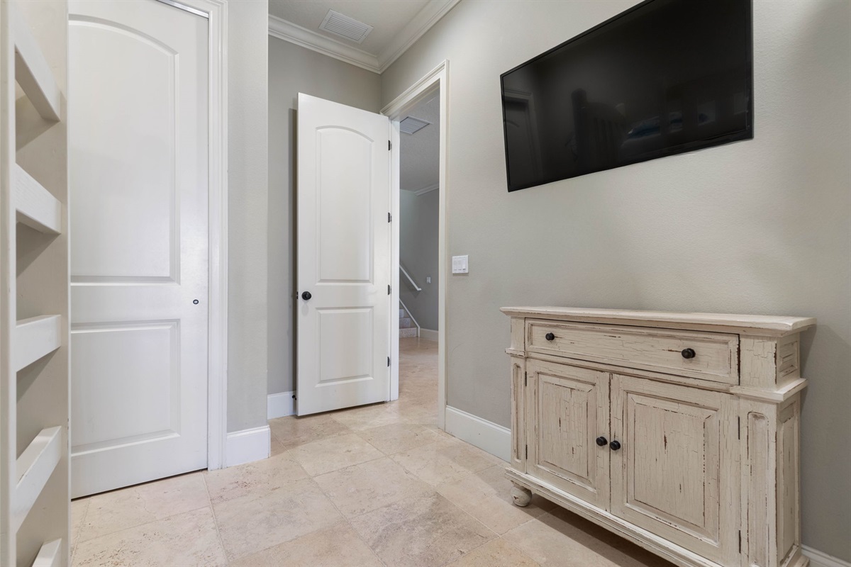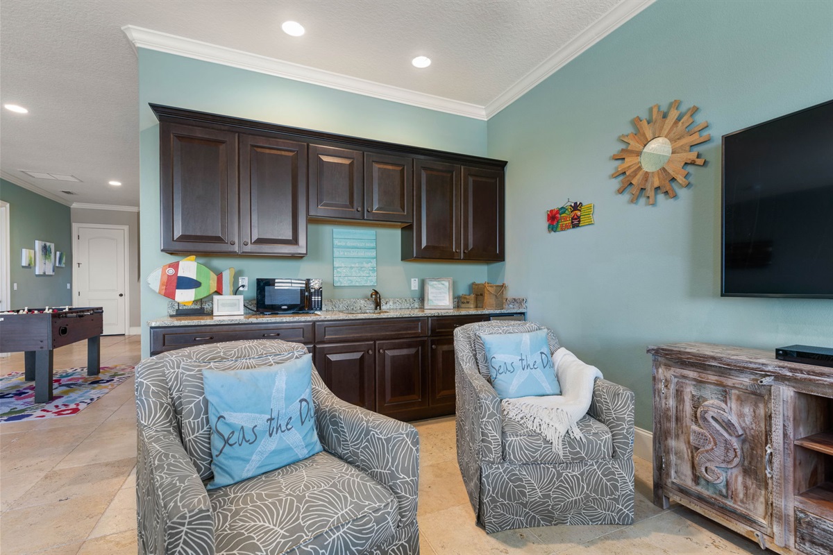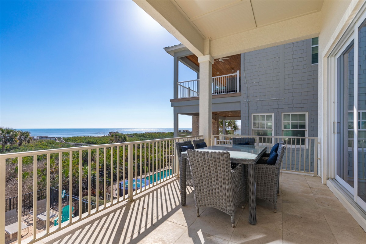 On the first floor, a second lounge area provides a relaxed space to watch TV or enjoy a friendly game of foosball. This level also provides convenient access to the outdoor patio, pool area, and beach boardwalk.