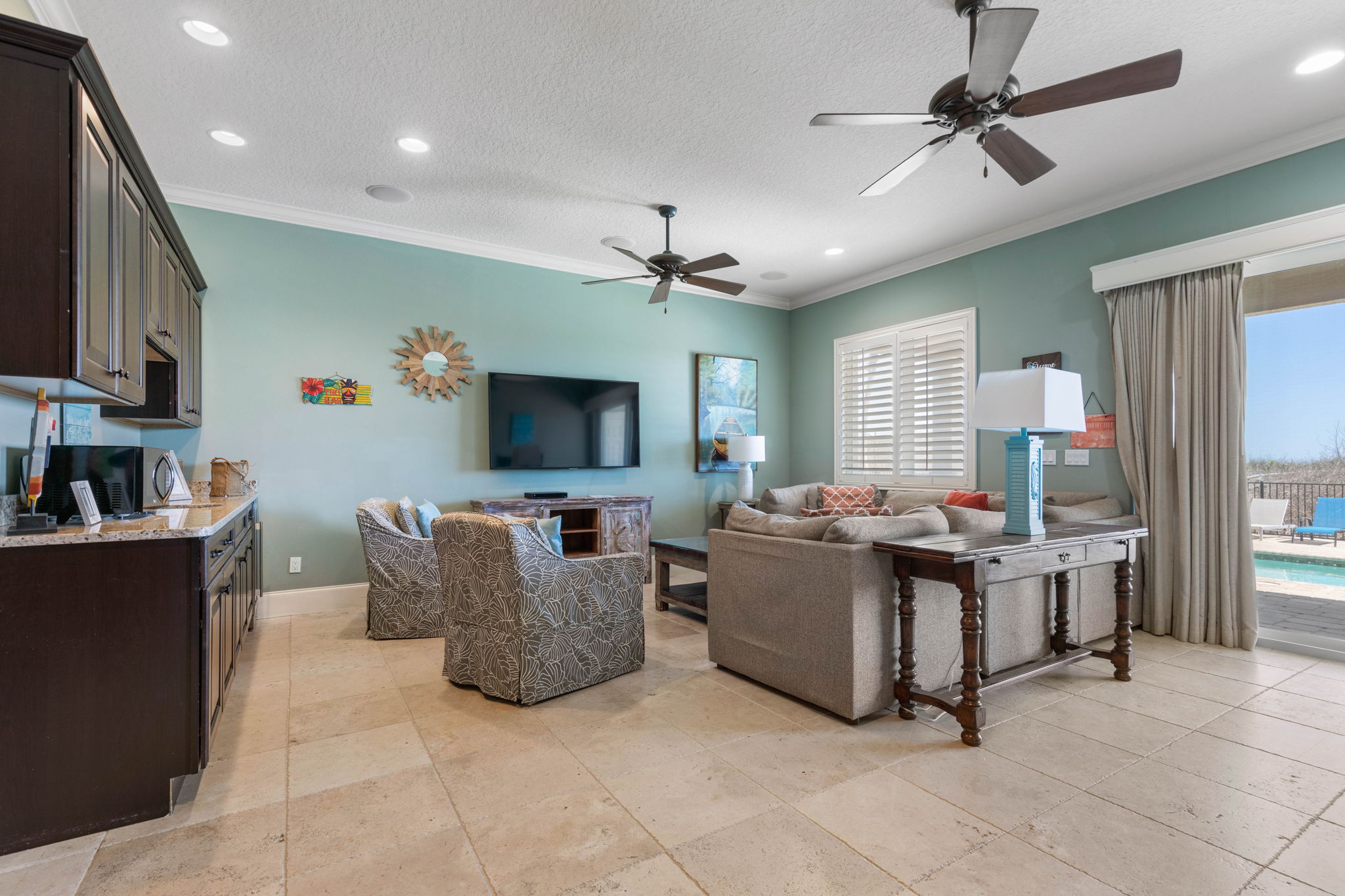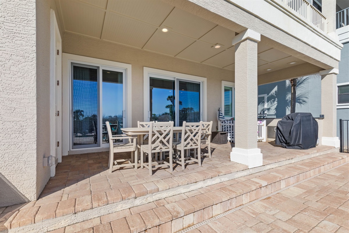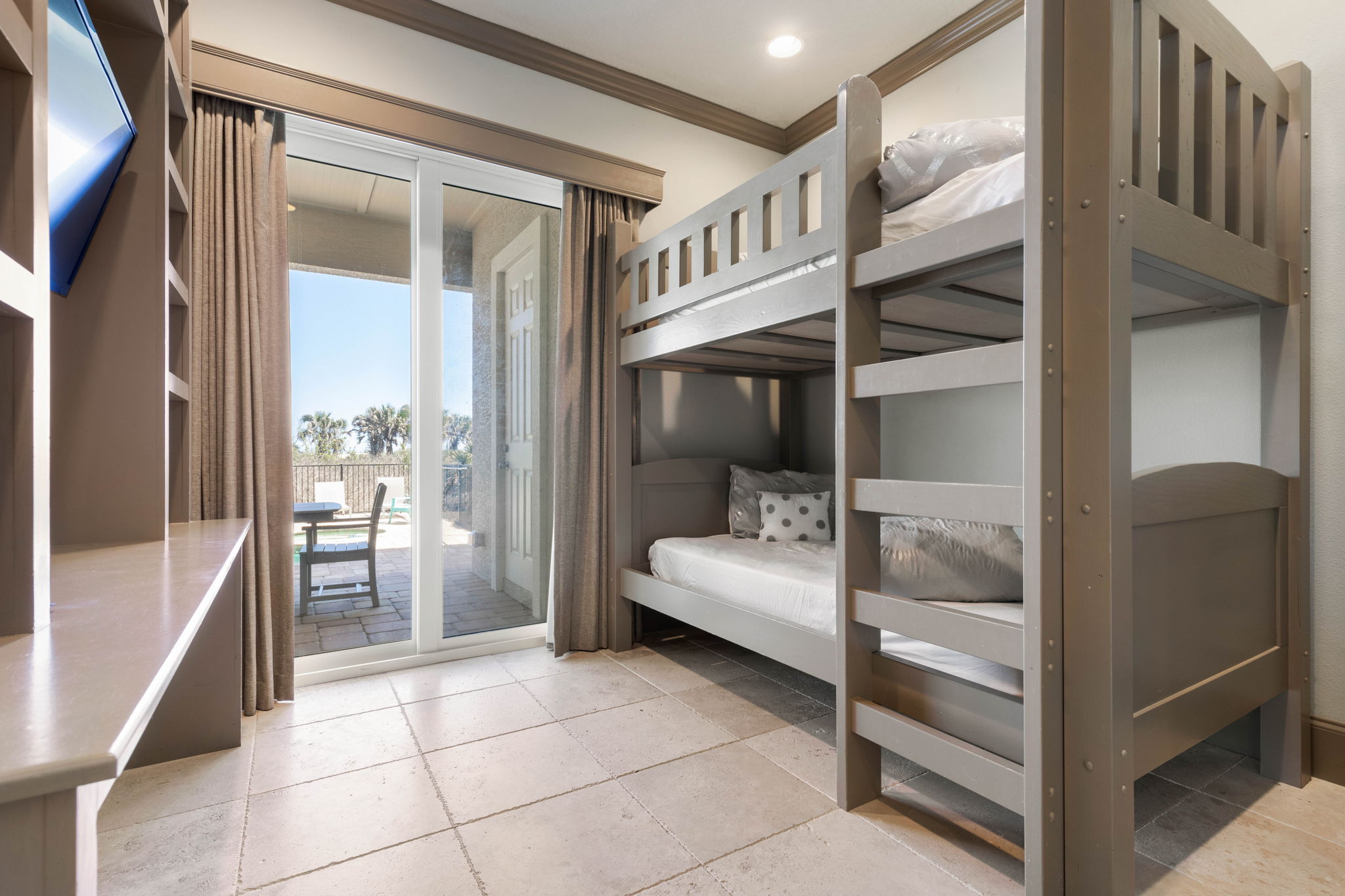 On the first floor, a second lounge area provides a relaxed space to watch TV or enjoy a friendly game of foosball. This level also provides convenient access to the outdoor patio, pool area, and beach boardwalk.