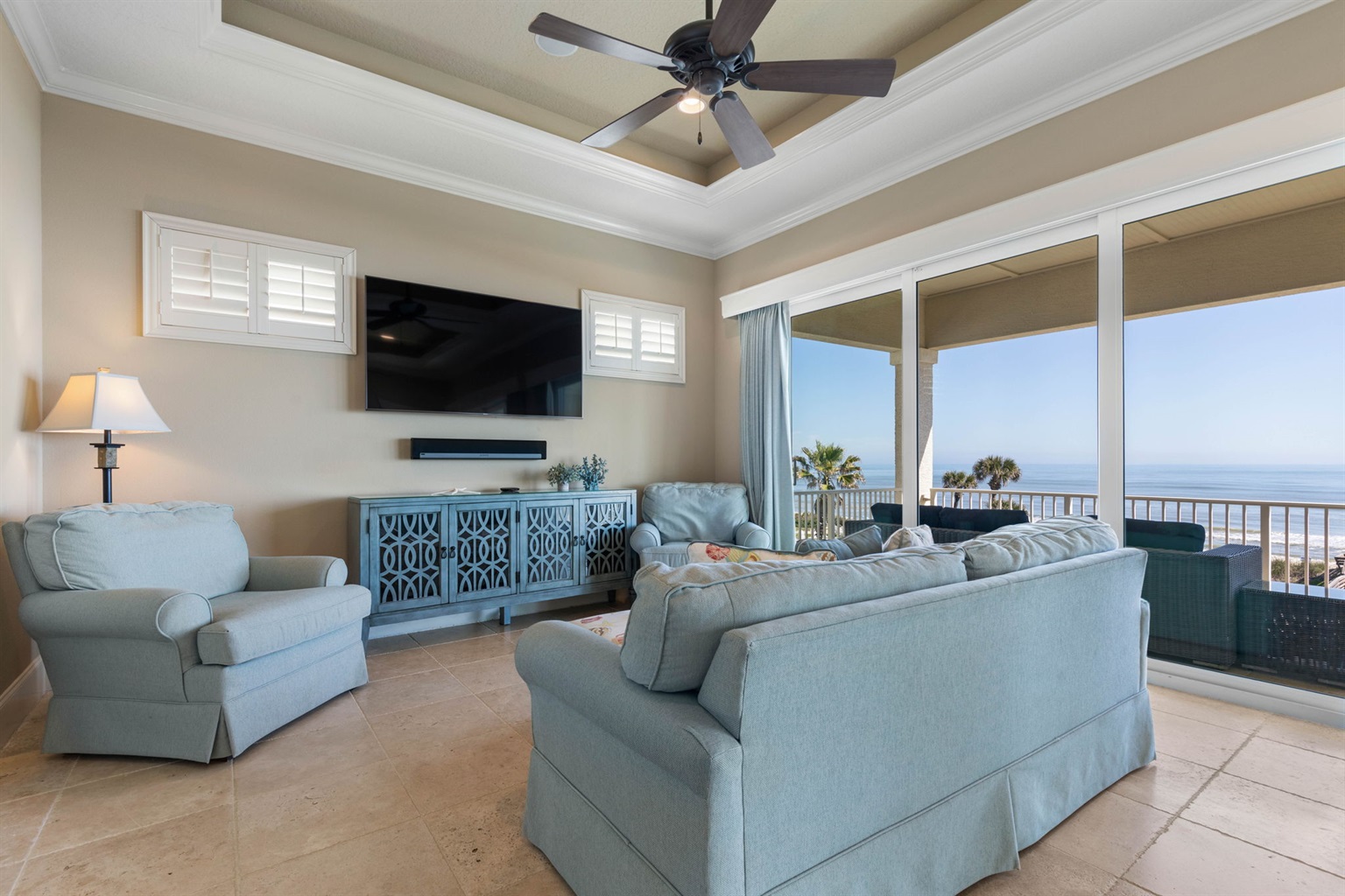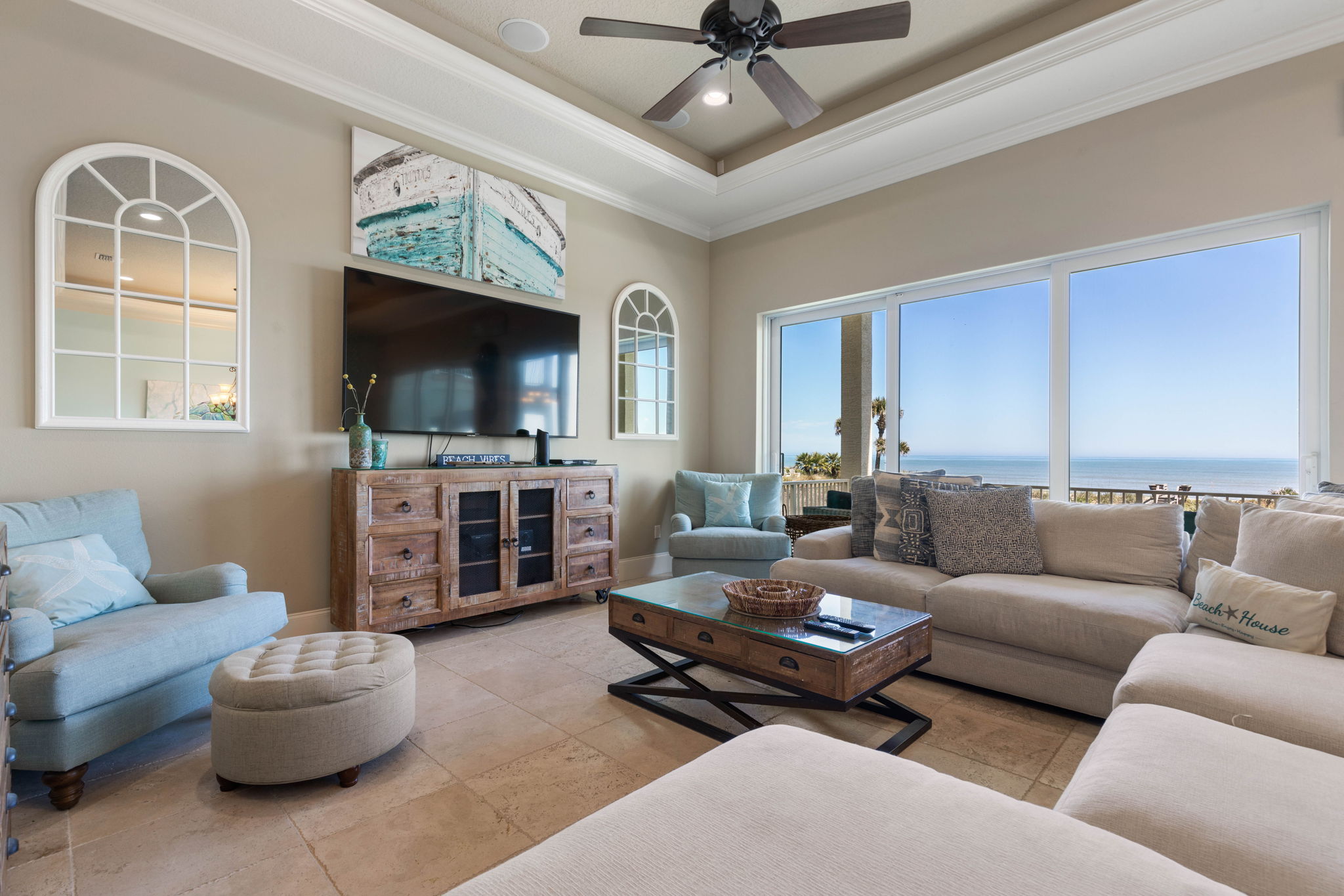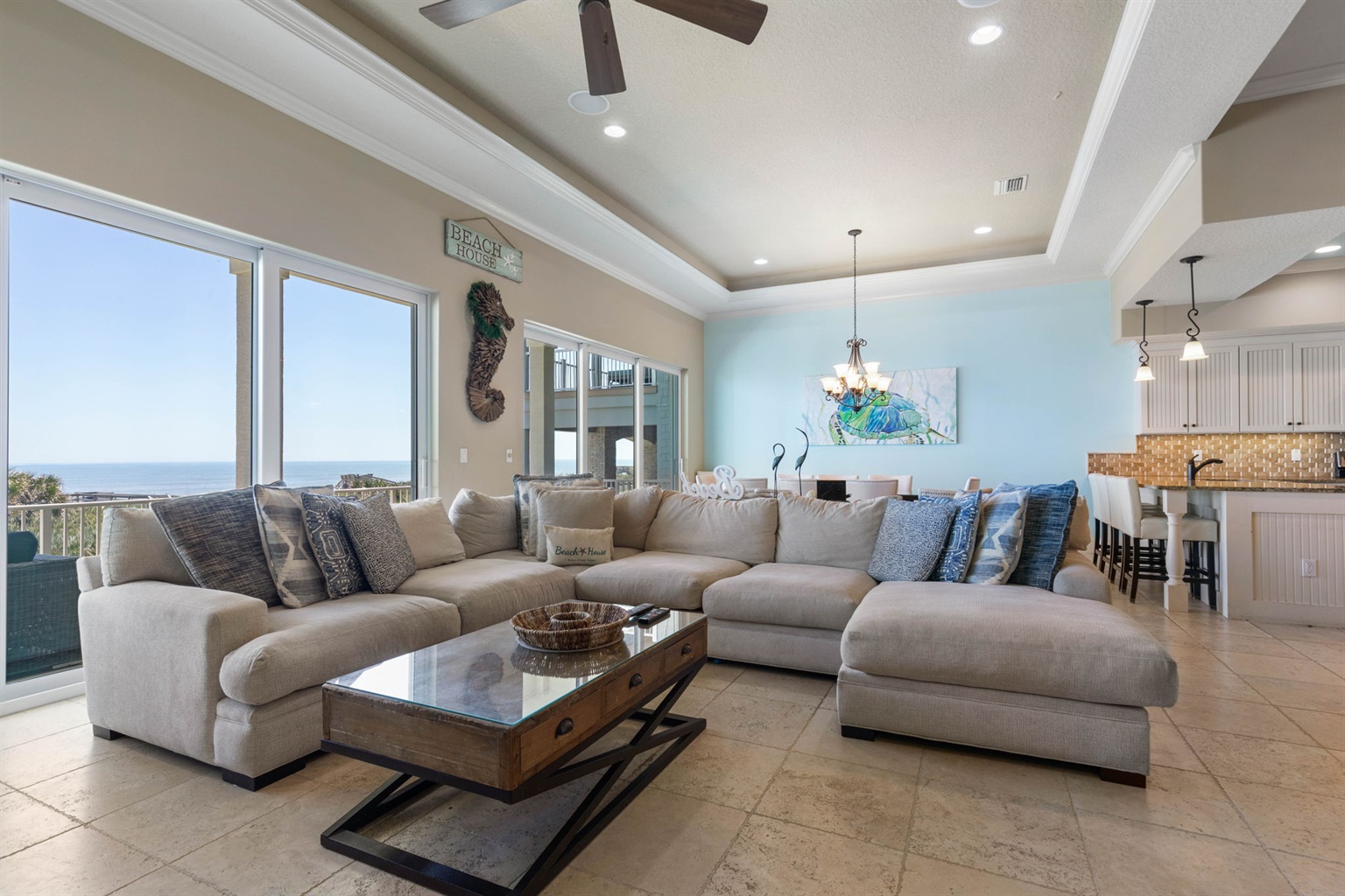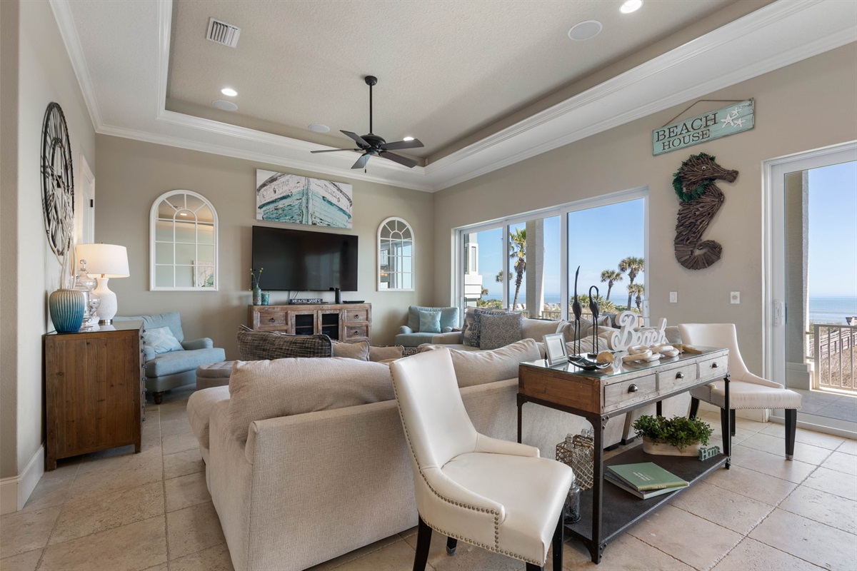 The main living room on the second floor offers comfortable seating and large sliding glass doors that open to an oceanfront balcony with sweeping Atlantic views.