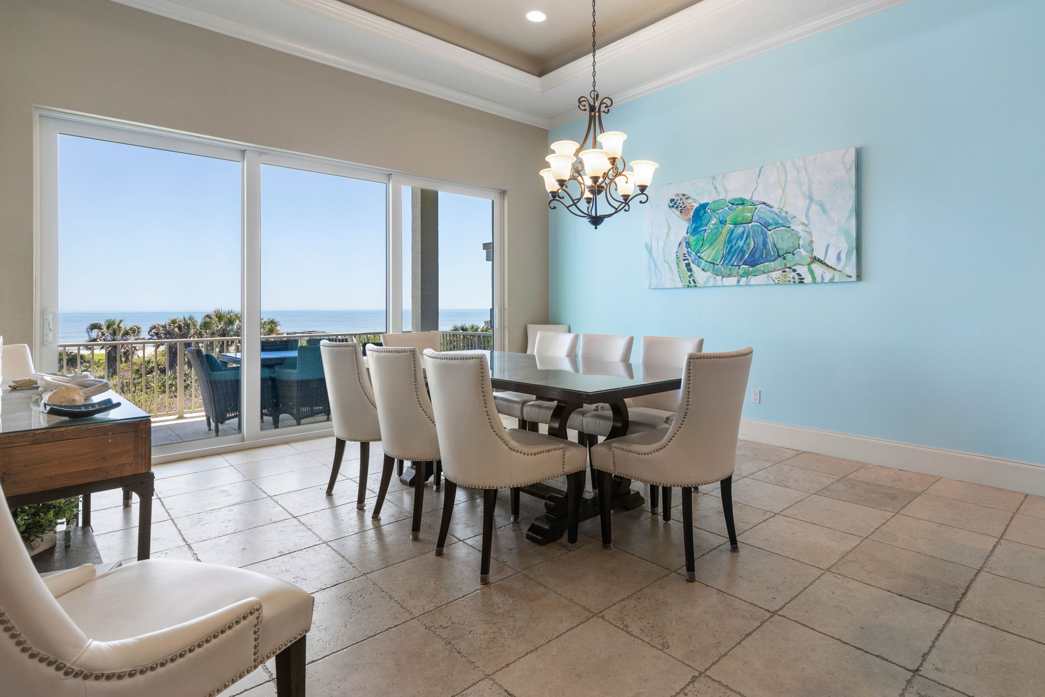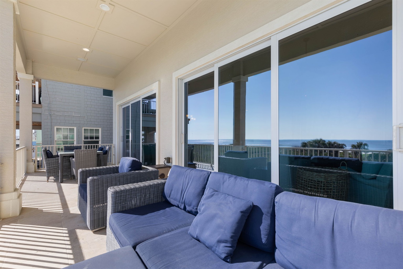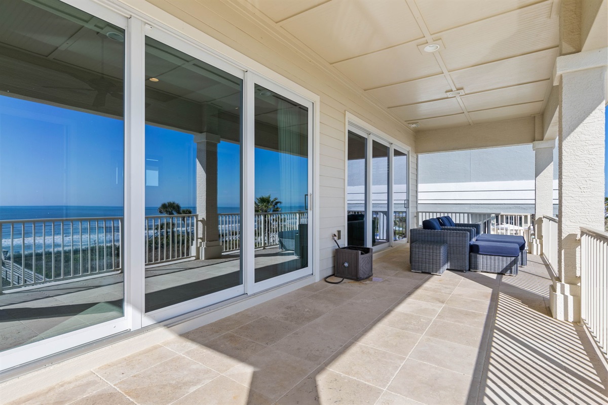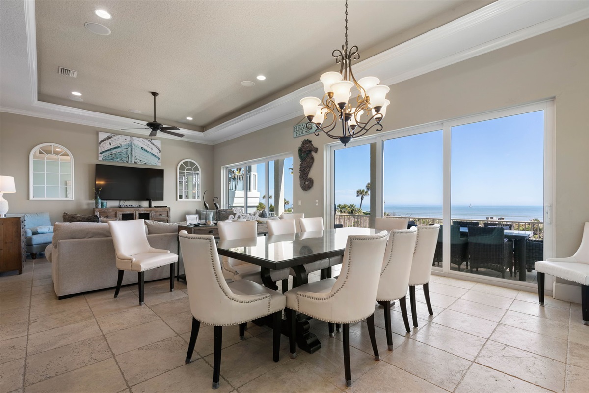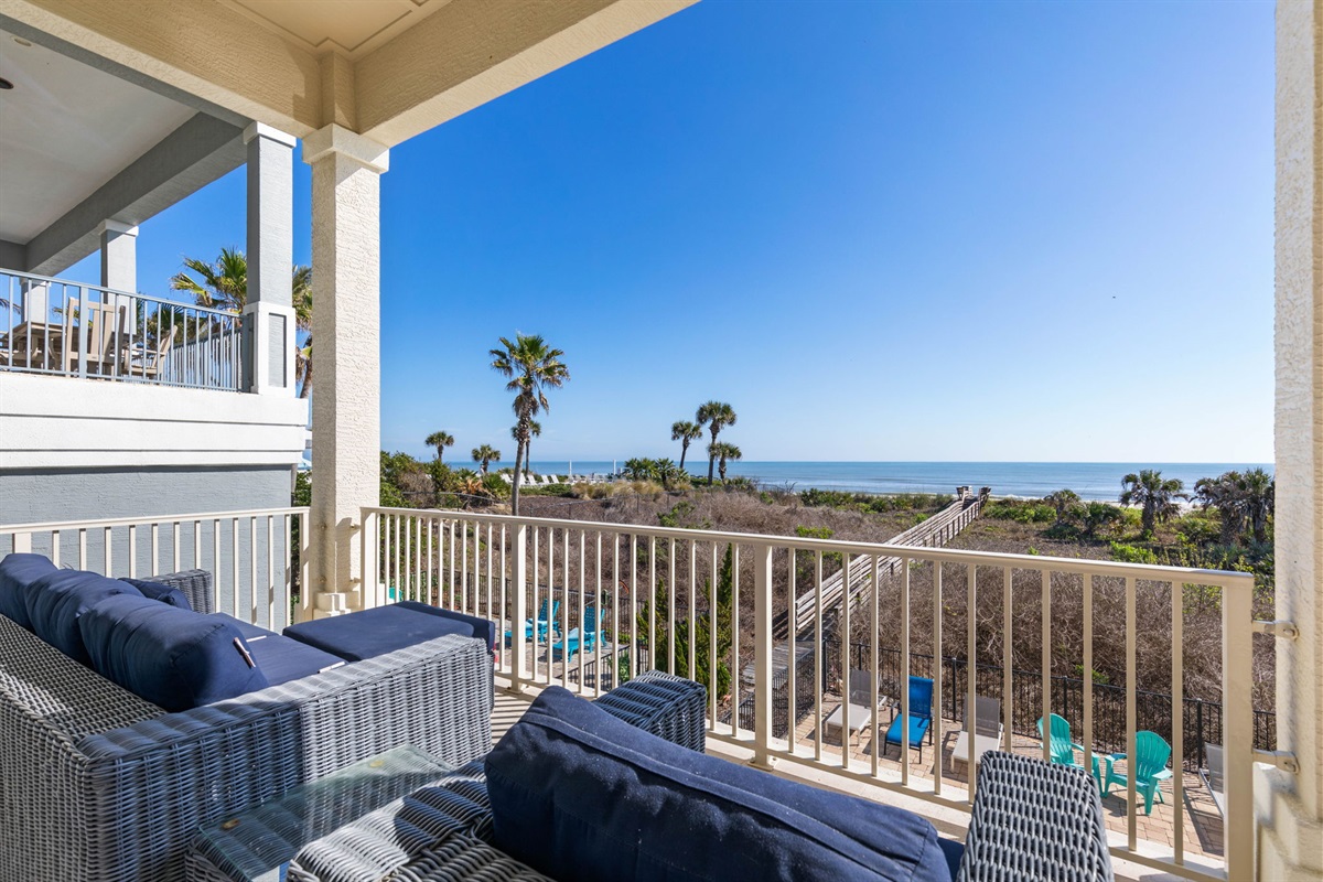 The main living room on the second floor offers comfortable seating and large sliding glass doors that open to an oceanfront balcony with sweeping Atlantic views.
