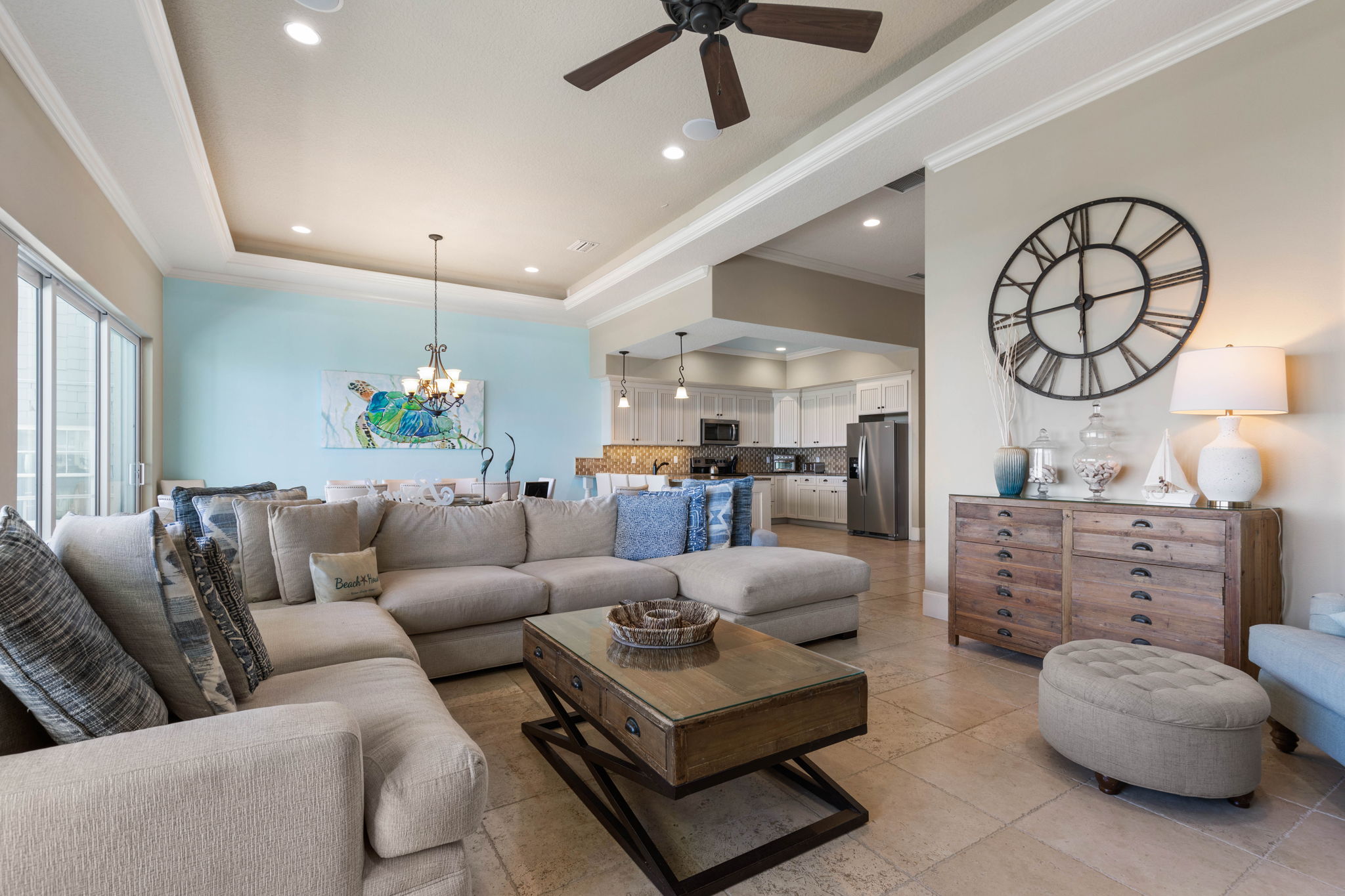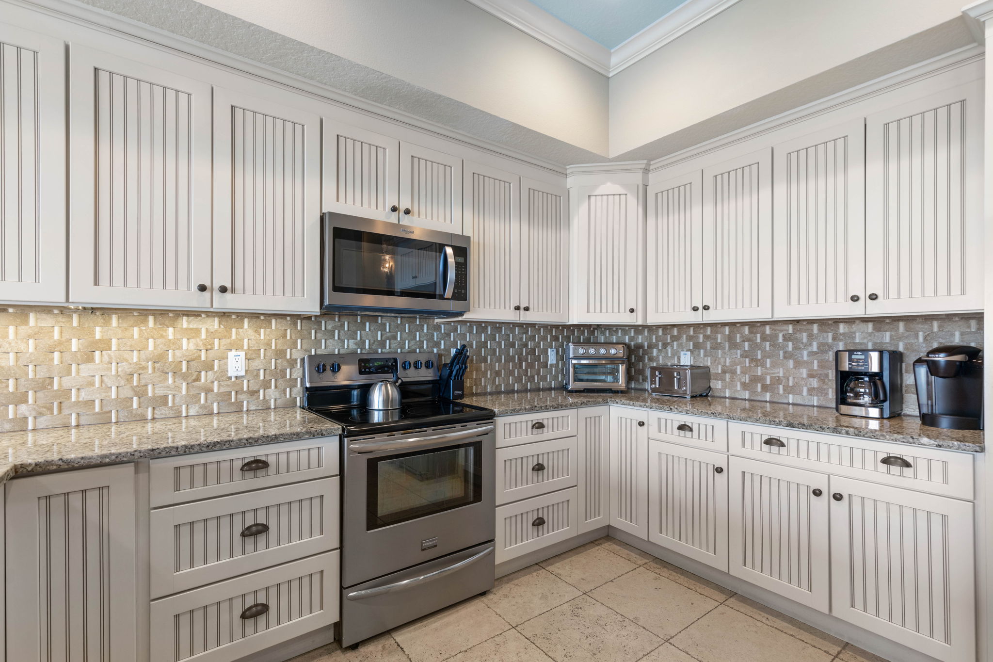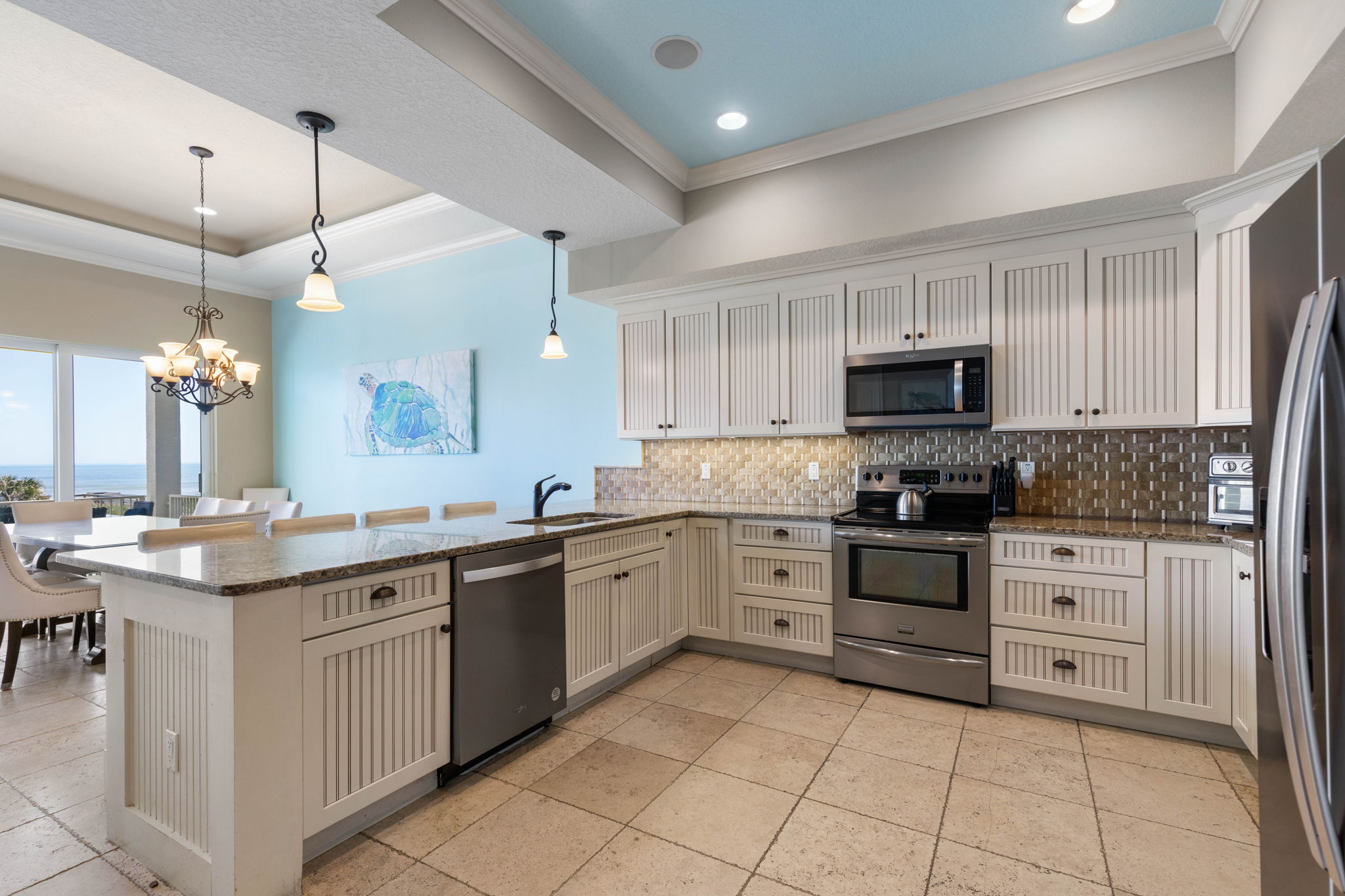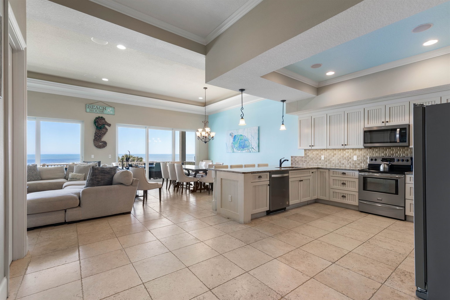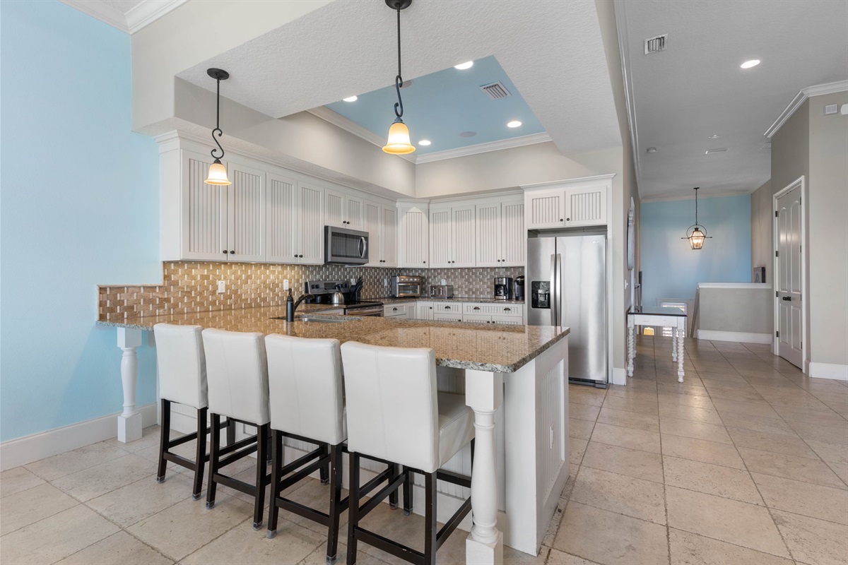 The fully equipped kitchen includes modern appliances, generous prep space, and everything needed to cook for large groups. Guests can brew coffee in the morning using either the Keurig or traditional coffee maker before heading out to the balcony to enjoy the ocean breeze.