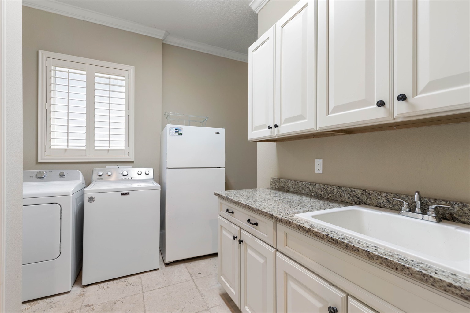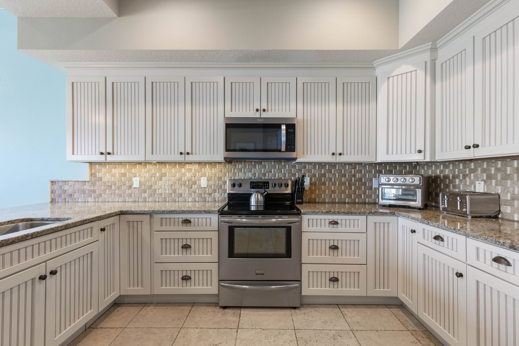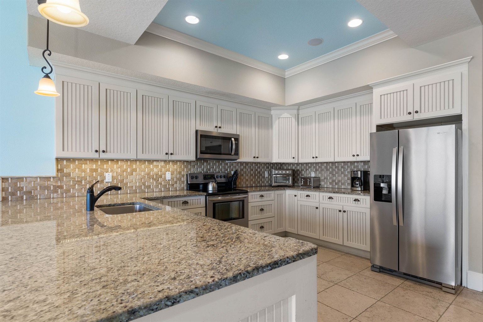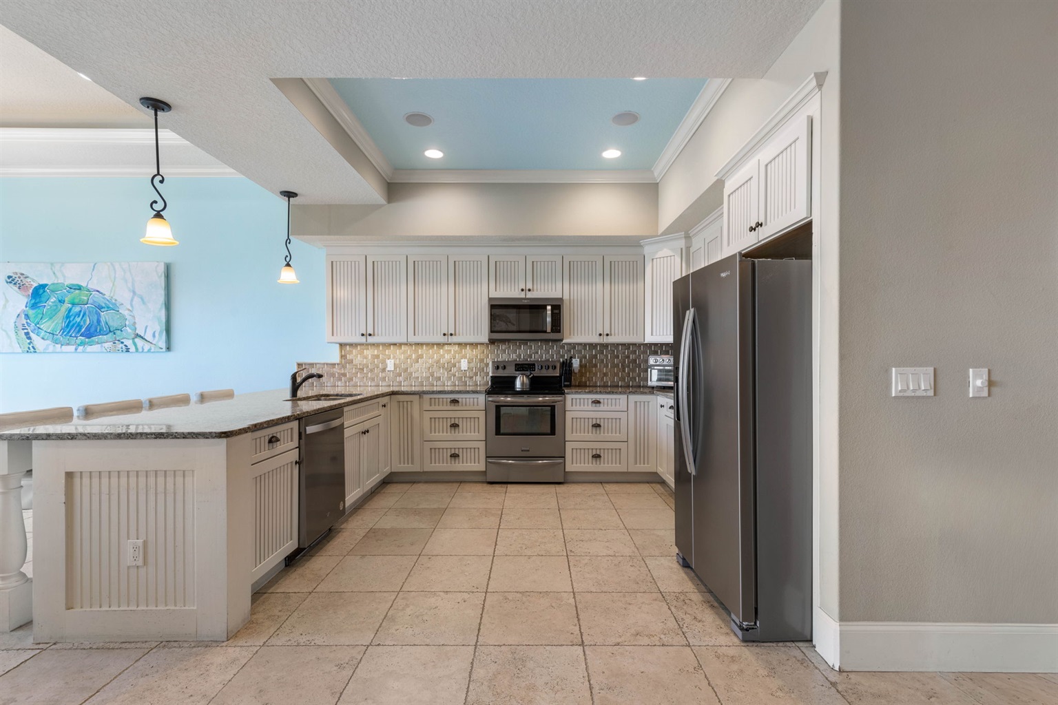 The fully equipped kitchen includes modern appliances, generous prep space, and everything needed to cook for large groups. Guests can brew coffee in the morning using either the Keurig or traditional coffee maker before heading out to the balcony to enjoy the ocean breeze.