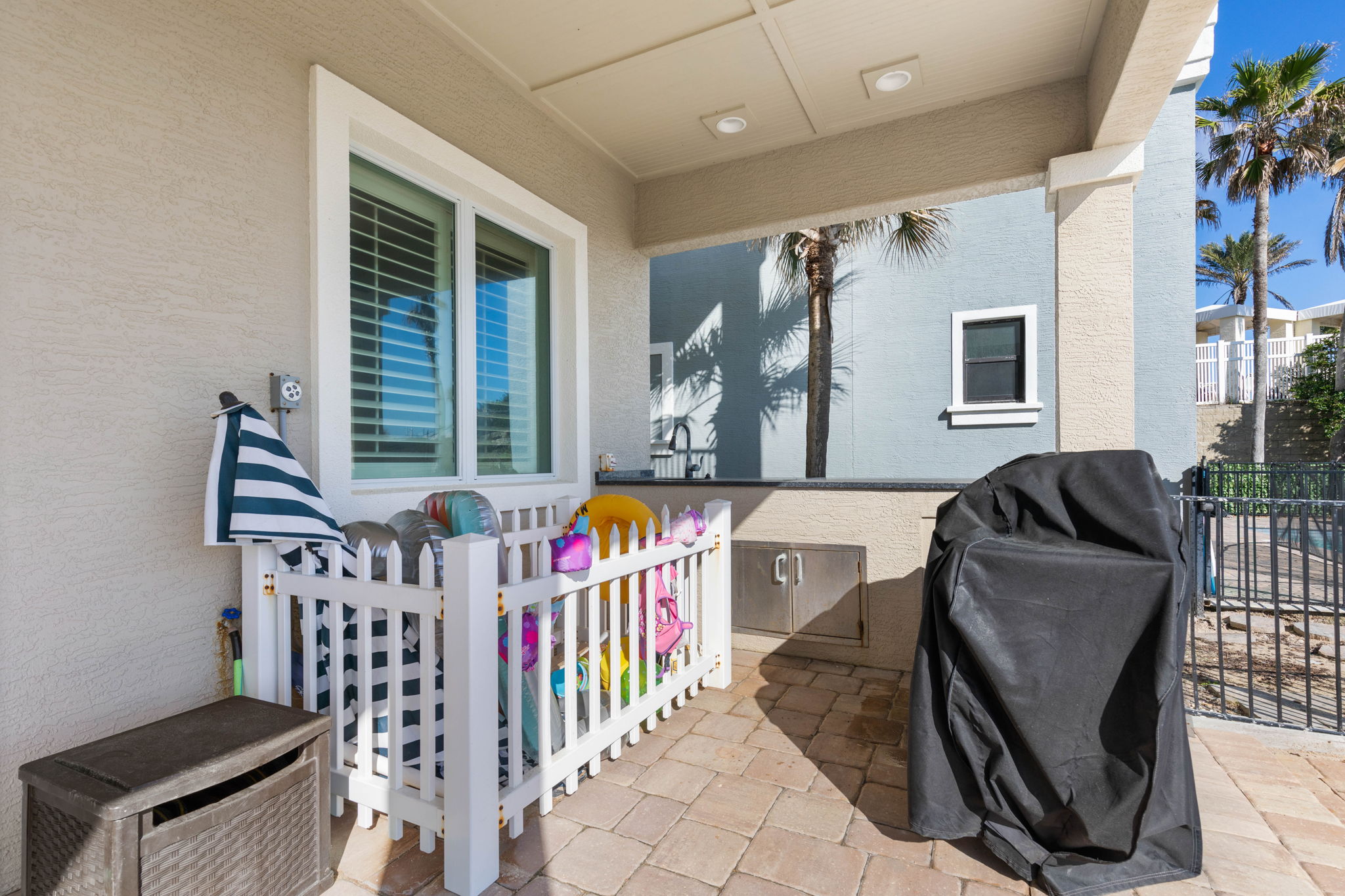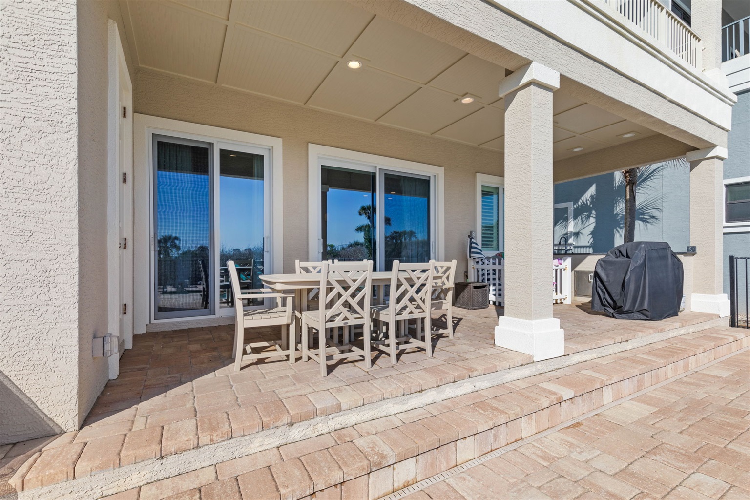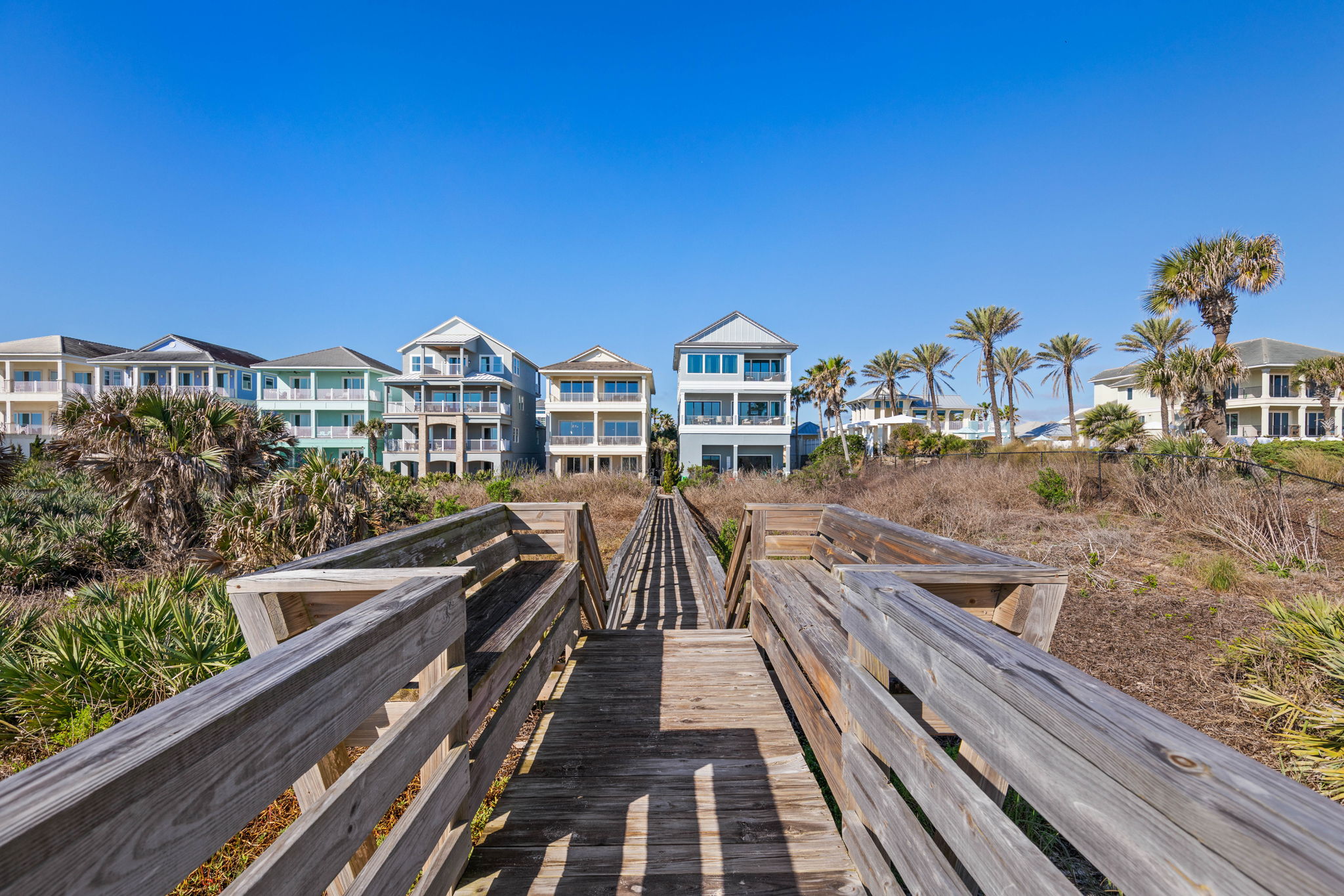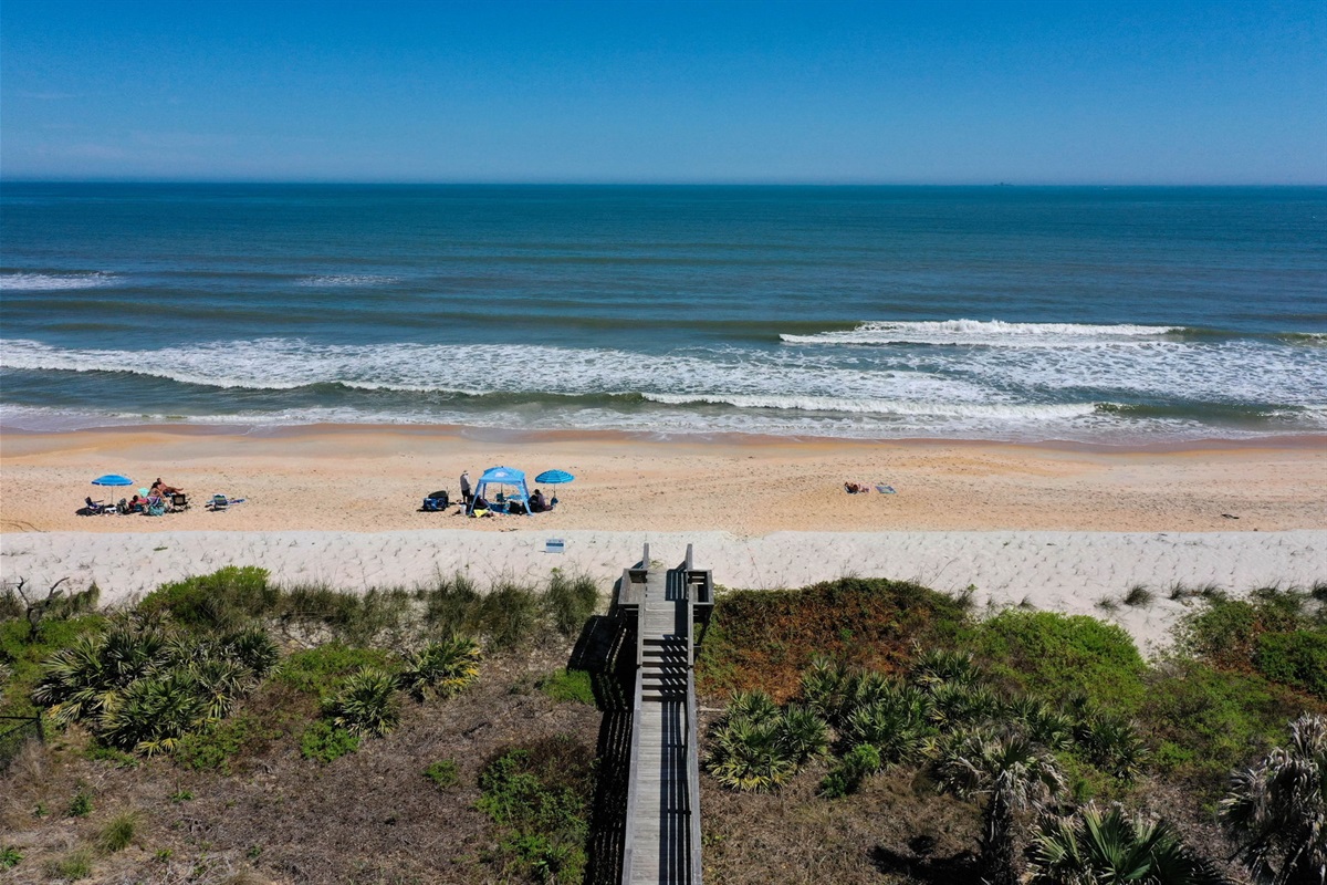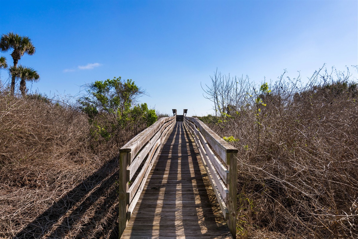 A private boardwalk behind the home leads directly to the beach, making it easy to move between the sand and the house throughout the day.