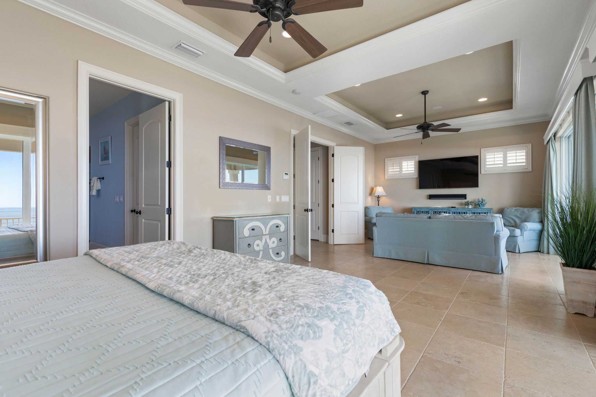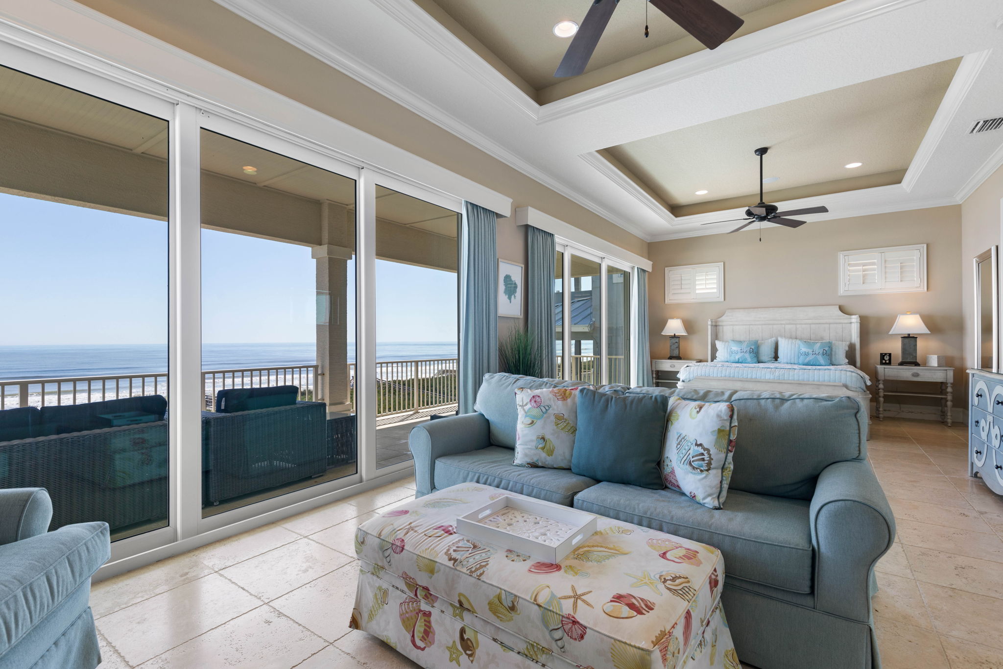 • Bedroom 5 – Oceanfront master suite on the third floor with king bed, sleeper sofa, seating area, private balcony, and ensuite bathroom with soaking tub and separate shower.