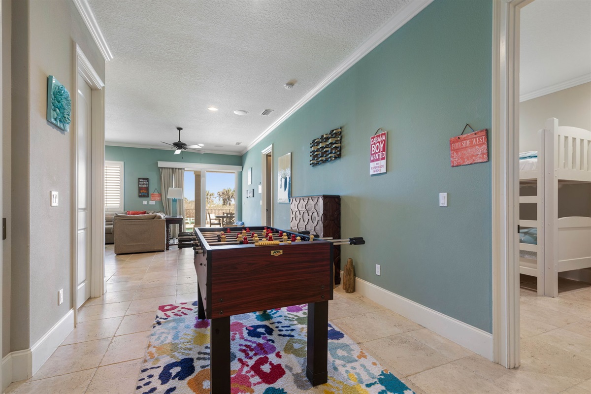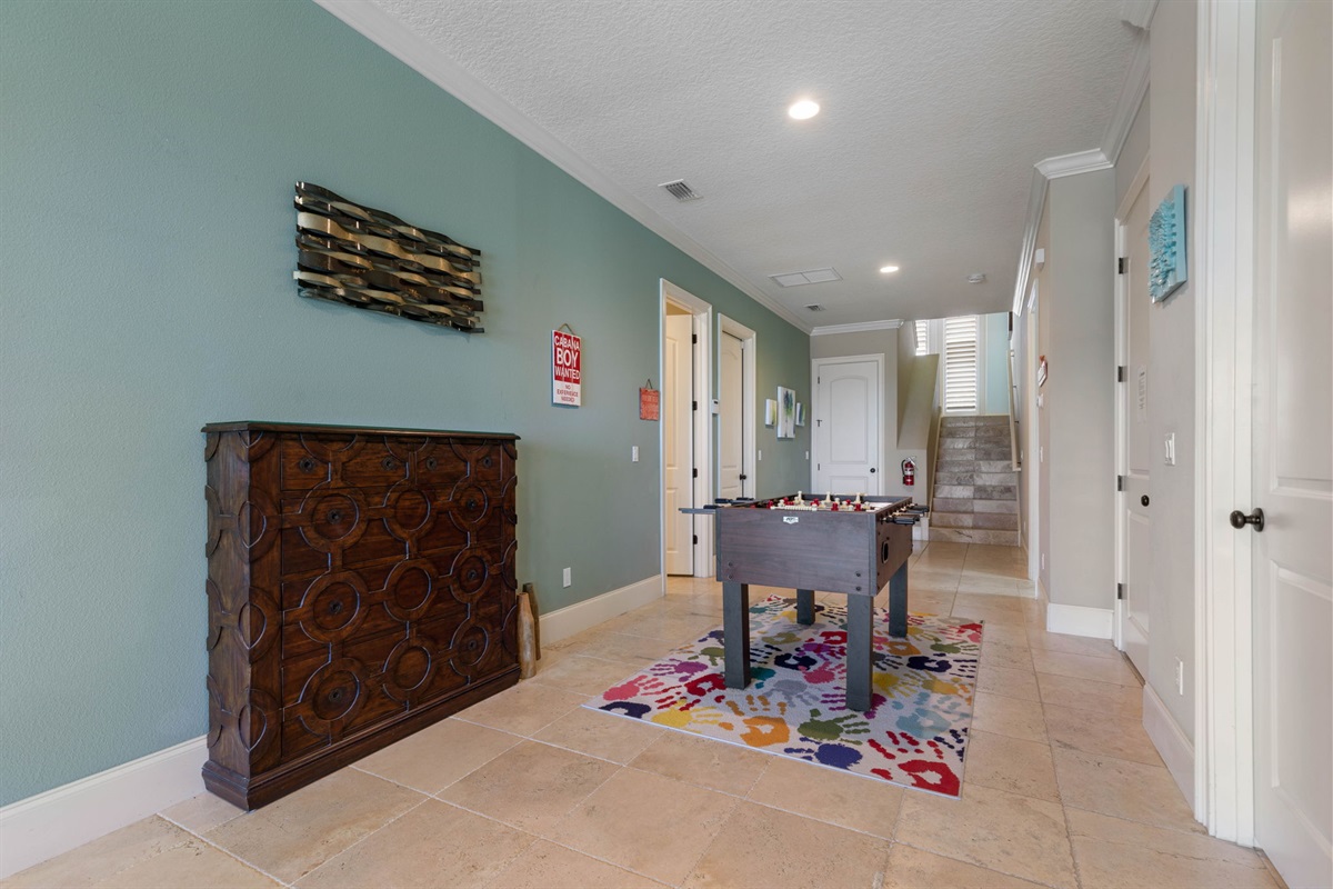 • First-floor game area with foosball and additional lounge space.