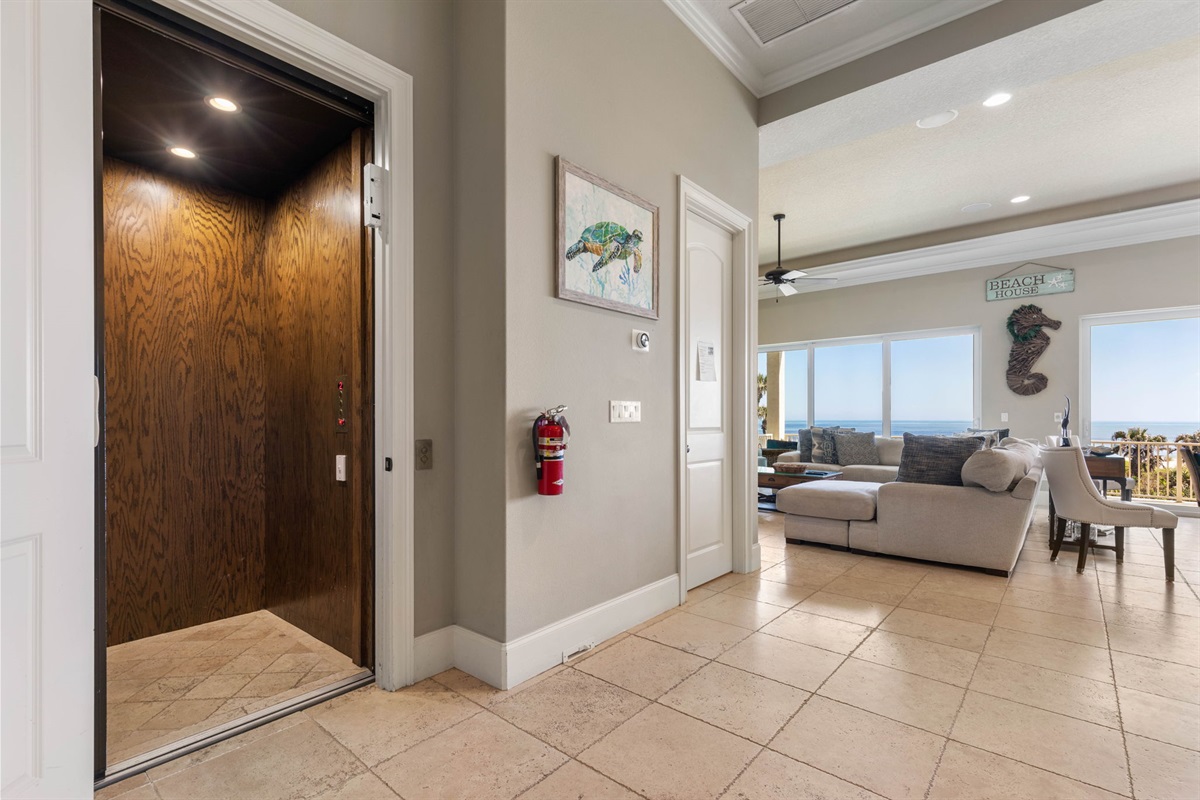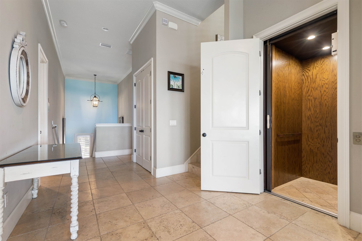• The home features stairs between levels, but an elevator is available for convenience.